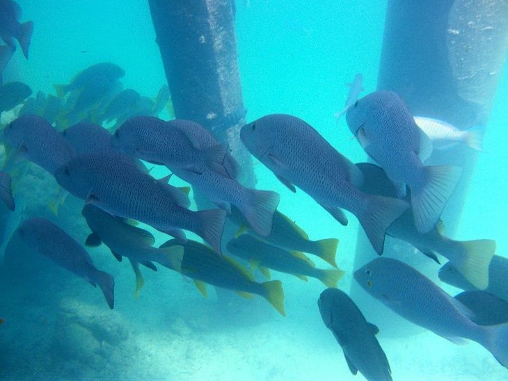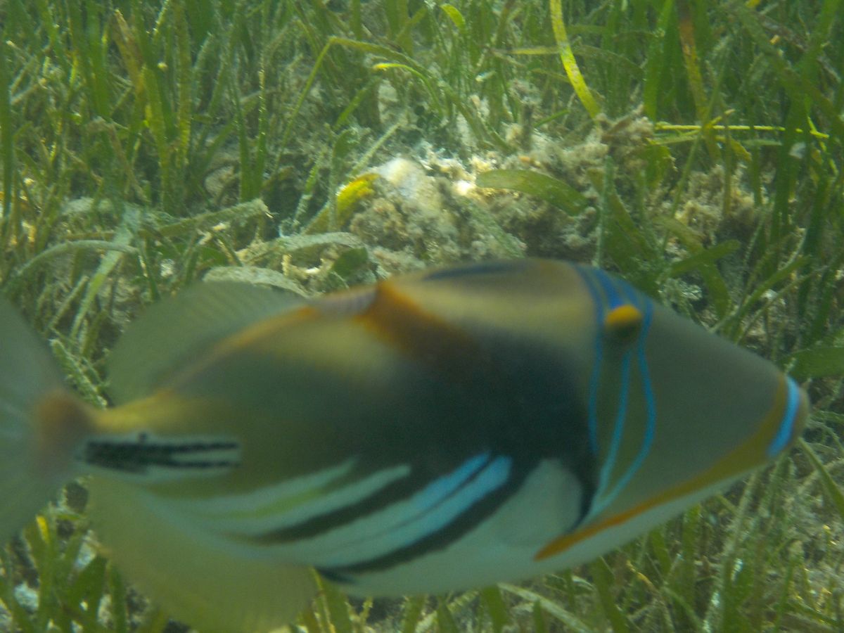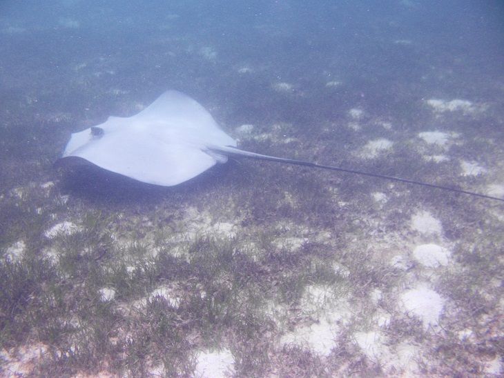 一番のシュノーケルポイントは、船着き場の桟橋の下です。桟橋の影で暗いのが難点ですが、水族館の中に居るくらいにお魚が見られます。また、桟橋から少し離れた場所も多くのお魚が見られ、ウミガメとエイにも遭遇しました。