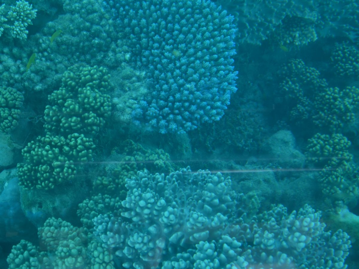 景色は写真のように、水の色が違う。 感激ものです。 バスクリンのお風呂の様な水の色です。 また、魚、カメが写っている写真を載せてますが、決して水族館ではありません(笑)。 グラスボートから撮ったものです。 参考になればして下さい。