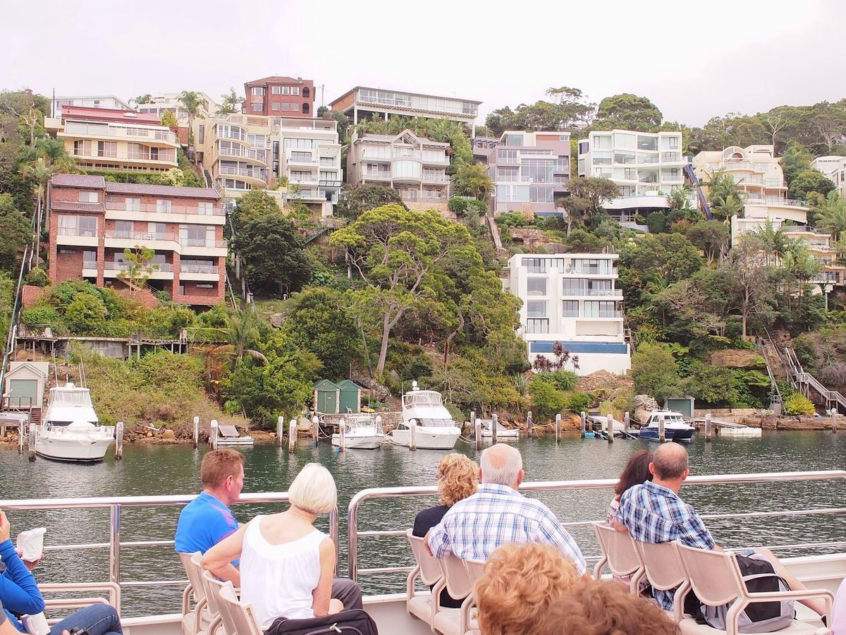 4年ぶり2回目のクルージングに参加しました。前回はランチクルーズ、今回はコーヒークルーズに乗船しました。平日にも関わらず満席近い乗客の数でした。ランチクルーズよりもコーヒークルーズの方がルートが広く設定されており、太平洋とシドニー湾の交わるポイントを通過し、たくさんのヨットが停泊している高級住宅街ミドルハーバーというところまでいくことができました。