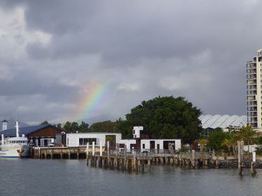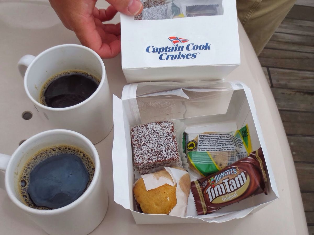 カップルや夫婦、友達同士や家族連れなどいろんな国の方々がたくさん参加されてました。たまに一人参加もいました。乗る前にチェックインしてチケットをもらうと、クック船長なような格好をしたキャプテンクルーズのキャプテンがうろうろとしていて、一緒に写真を撮ってもらいました!バウチャーをコピーしていなかった私たちのチェックインはとても時間がかかりましたがカウンターの方がコピーしてくださりとても助かりました。飲み物もコーヒーから様々な美味しいソフトドリンクがおいてあり、お菓子と一緒に美味しくいただきました。お菓子は可愛い箱の中に5種類ほどはいっており、ケーキが特においしくて飲み物とよくあいました。私は船に酔いやすい体質なのですが、まったく酔うことがなくオーストラリアの雄大な景色を存分に楽しむことができて本当に感動しましたし、もう一度このクルーズに乗りたいと思いました。船の中は綺麗で、一階と二階のつくりが異なっていたことも興味深かったです。