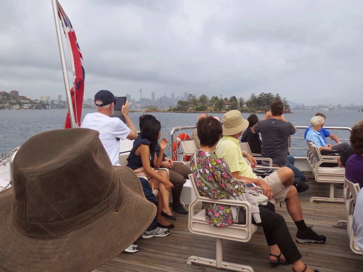 11時半に間にあうよう必死でダーリングハーバーに駆けつけましたが、結局12時5分過ぎに船は到着しました。天気は、曇り時々晴れ間と小雨でしたが、室内で寒くありません。窓際の席からは、オペラハウスを別の角度から見られ、外輪船やエンデバーもしっかり写真に撮りました。就航して間もなく、調理のいいにおいに包まれました。何種類もの料理が並び、お皿いっぱいにとりました。どれも悪くない味です。私たちの席のすぐわきに、ケーキとカットフルーツが置かれていたので、食後のデザートに紅茶とともに味わいました。途中から乗船の方々のために、すぐ料理は補充されて十分でした。夢中になって外を見ていると船内のステージの方からガイドさんが、下船までずっと説明のしっぱなしでした。英語でしたから少しわかる程度でしたが、サービスもいいように思います。船に弱いかたにも安心してのれます。2時間が、あっという間でしたが、あとで航路をみるとけっこう遠くまでいっていました。その後の滞在中フィッシュアンドチップスを3回ぐらいいただくチャンスがありましたが、こちらの料理の方がおいしかったです。次回は、天気のいいときに船外の空気をいっぱいに吸いたいと思います。