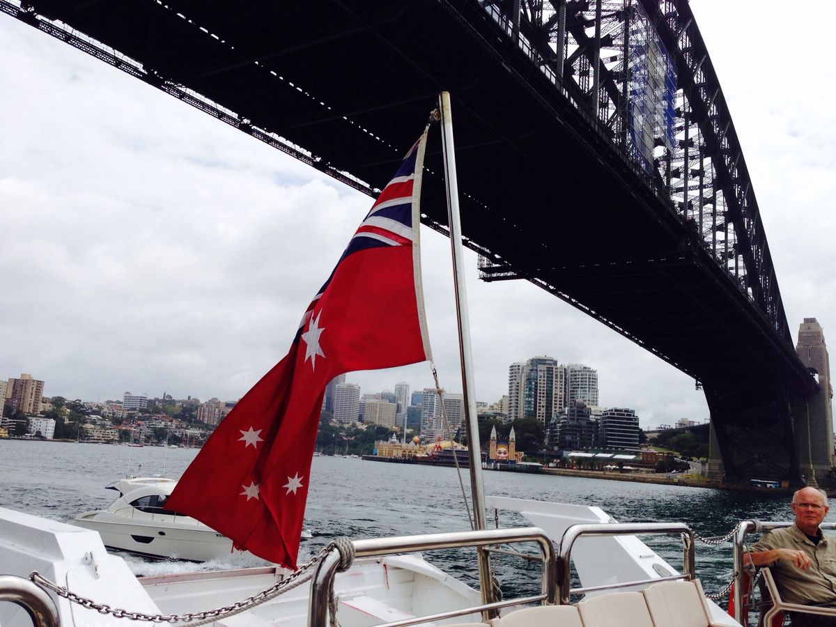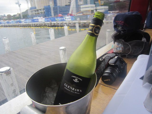 にしていました。4/28早朝にホテルに到着。チェックインも無事にでき、着替えてからゆっくりとダーリングハーバーへと街並みを散策しながら向かいました。11時半にワーフに着き、美しい港をバックに写真を撮りました。12時前に乗船すると、フレンドリーなスタッフに迎えられ着席。