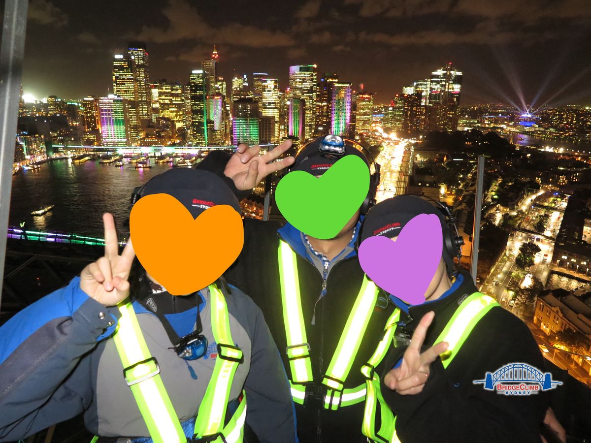 7/16のナイトライドに友人と参加しました。日本人は私達だけで、他はアメリカ人ファミリー、イタリア人ファミリー等などのグループでした。オールイングリッシュでの説明で、所々理解できる程度でした。同意書?承諾書?的なものは、全て英語で書かれていて、どうしよう!?と思ってたら、日本語の書類があって一安心。あとは、他の人の見よう見まねでやりました。ブリッジに登り始めるまでの道のりが板だったのが、もしかすると一番怖かったかもです。登り始めると足元は抜けてない鉄板の上だったので、全く恐怖感はありませんでした。それよりもシドニーの夜景の美しさに溜め息ばかりでした。案内してくれたお姉さんが、シドニーの歴史のこととかブリッジの事とか最初から最後までずーっと話してくれていたんですが(多分)、内容はほぼわかりませんでした。帰ってきて写真の購入をするエリアに戻ってきたら、日本に2年間留学経験のあるオージーのお兄さんがたまたまいて、日本語で購入手続きができました。写真を買わなくても、SNSにupする場合は、3枚だけは無料でデータをくれるみたいでした。(友人はパスワードを忘れたみたいでFBにupすることはできませんでした。)