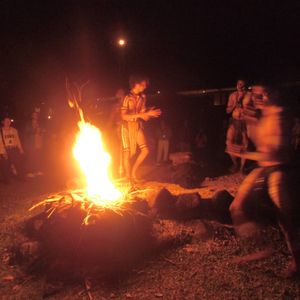 暗闇で火を囲みながら、歌いながらダンス