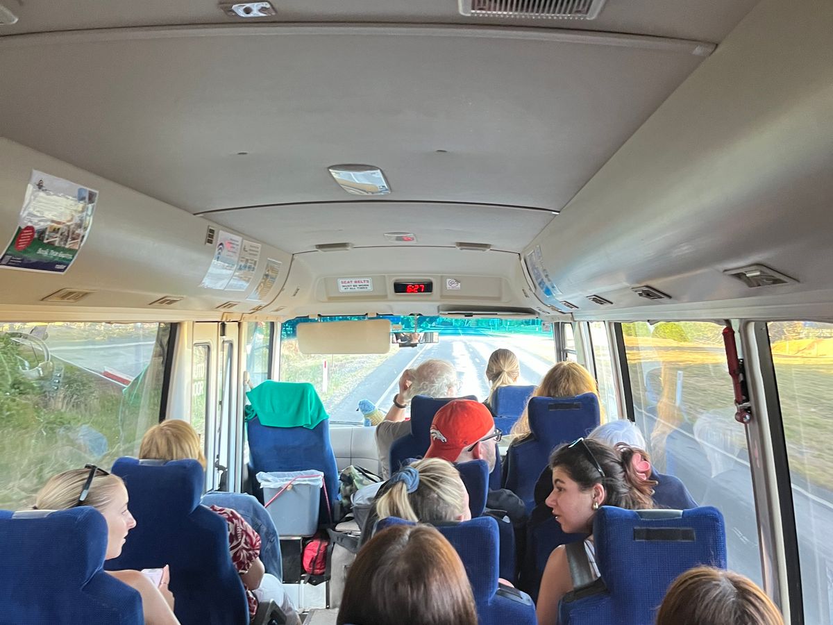 10名乗車くらいのワゴン車で、シドニーからブルーマウンテンまで1時間20分くらい(渋滞無ければ)。飲み物は停車箇所で購入も可能ですが、準備していった方がベターと思います。