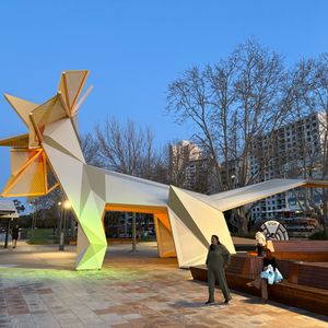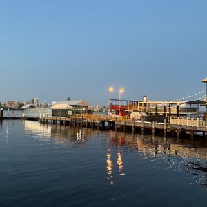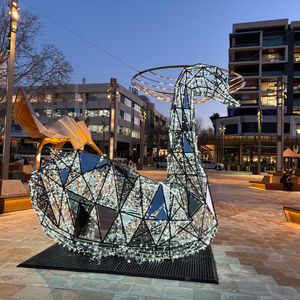 エリザベスキーの水の波紋をモチーフにしたモニュメントの前に集合。背の低いフェリーの乗りエリザベスキーから対岸へ。そこはパース動物園が近いこともあり、色々な動物のモニュメントが置かれている。夜はライトアップされていた。そのフェリー桟橋の近くにシーフードレストラン?があり、食事をしました。食事だけなく、フェリーにも乗れたので良かった。