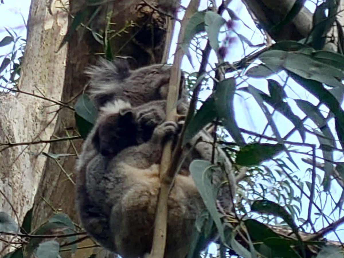 そして最大のミラクルがその後に。ツアーガイドさん秘蔵の野生コアラスポットへ。スポットに到着してすぐ、ツアー参加者の一人がコアラを発見するや、立て続けに3匹のコアラに遭遇。さらなるミラクルで、4匹目は手が届かんばかりの高さに、しかも子供コアラと一緒に佇んでいるではありませんか! ガイドさんも、長年ガイドをやっているが、野生のコアラで子供を見るのはほぼあり得ないとのことで、とんでもなく貴重な体験となりました。コアラは雨が降った後はユーカリの木の低いところに下りてくるとのことで、朝方までのぐずつきがまさかのアシストになるという、奇跡的な体験となりました。