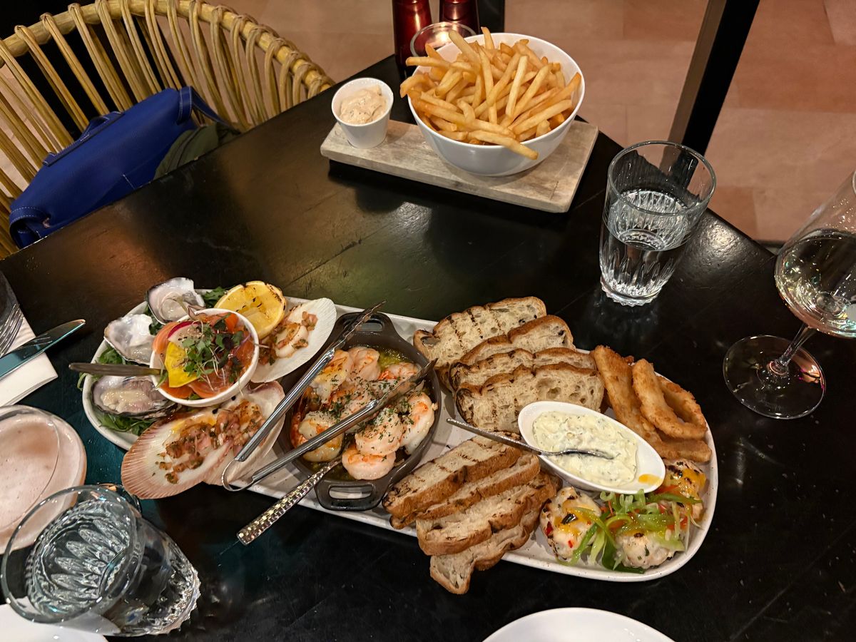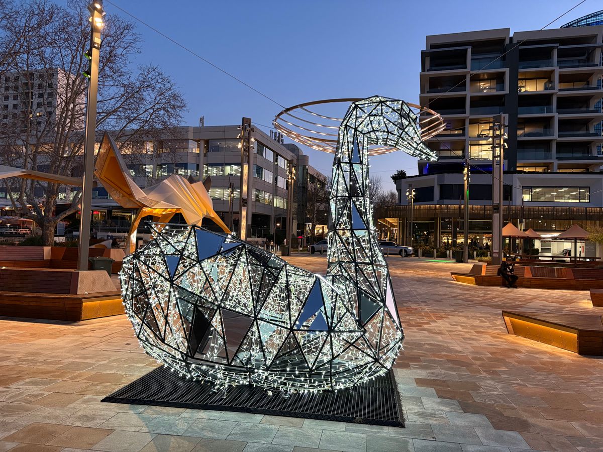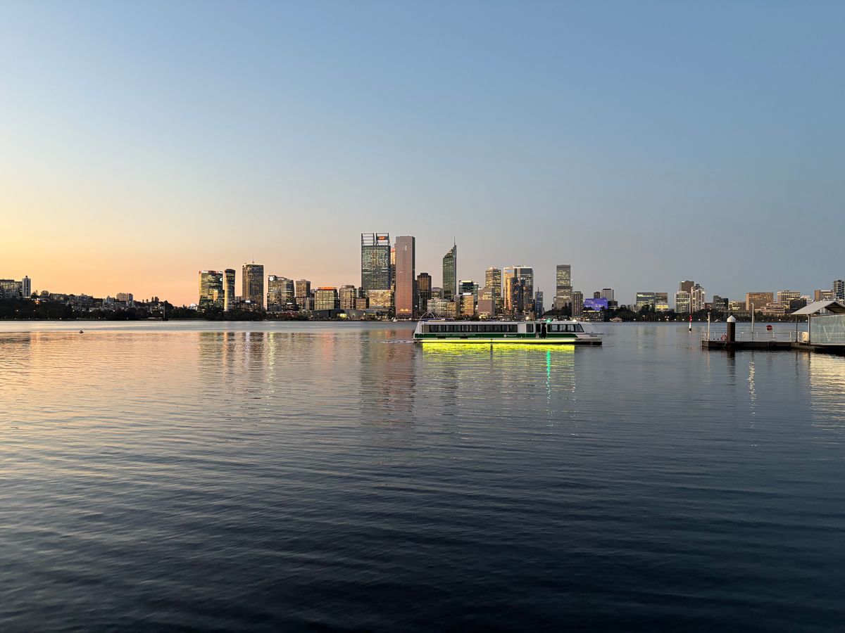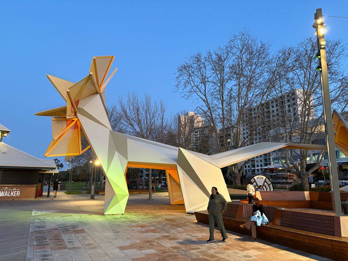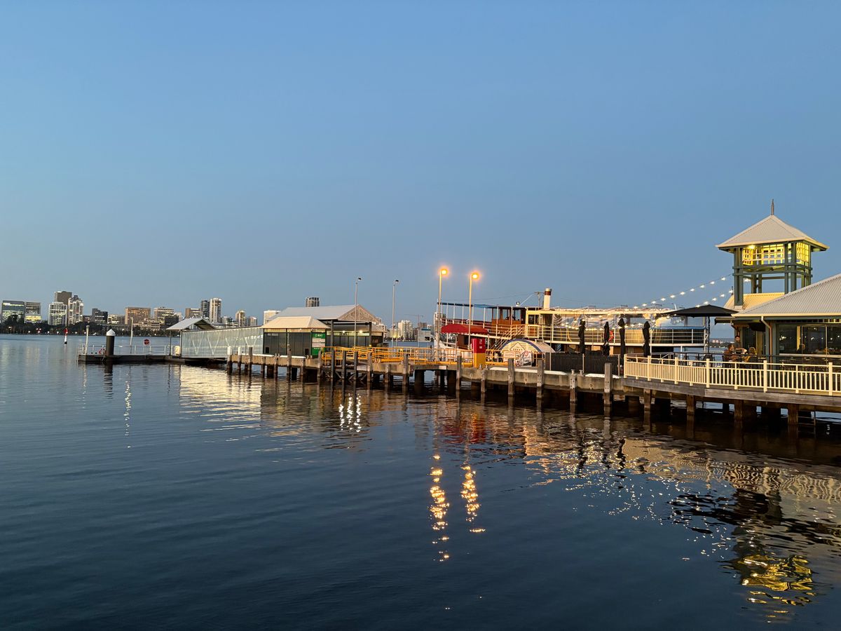エリザベスキーの水の波紋をモチーフにしたモニュメントの前に集合。背の低いフェリーの乗りエリザベスキーから対岸へ。そこはパース動物園が近いこともあり、色々な動物のモニュメントが置かれている。夜はライトアップされていた。そのフェリー桟橋の近くにシーフードレストラン?があり、食事をしました。食事だけなく、フェリーにも乗れたので良かった。