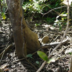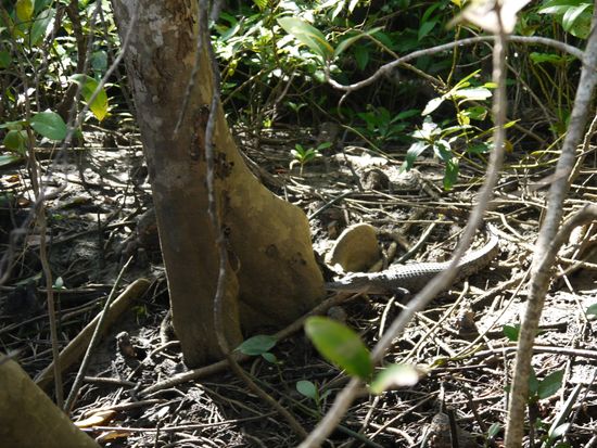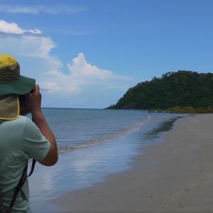 そして、川水は濁っているけれど、これぞ熱帯雨林と言わんばかりのデインツリー川で、「イリエワニ探しクルーズ」。船長は英語ガイドの二役で、かなり遠くから小さいワニを見つけて、そっとボートを近づけてくれました。しばらく全く動かないので置物かと思いましたが、急に逃げていきました。探しているときの船長さんの目は、プロフェッショナルで独特で、写真に収めたかったぁ。運が良い席で、ワニを3匹とも見ることができました。その後一路、ケアンズのそれぞれの希望の場所で降ろしてくれましたので、助かりました。