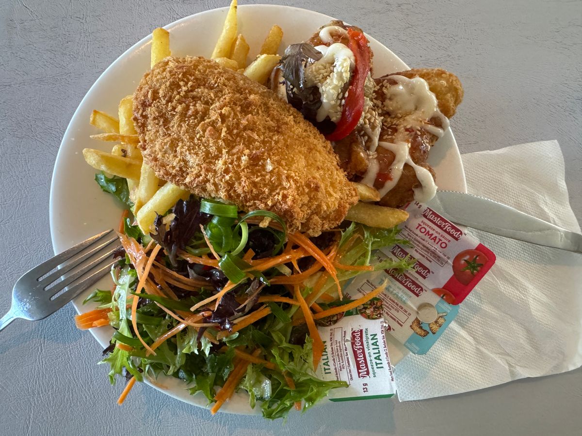 イルカが終わったあとは他の乗客が降りたあとの船内でフィッシュアンドチップス+チキンを食べましたが、これが美味しい。ただし量は多いです 笑