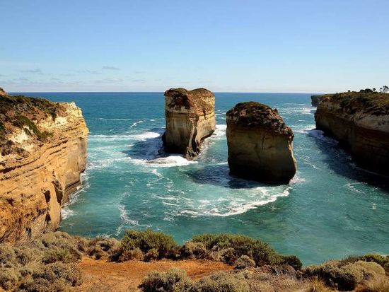 この頃は天気も真っ青な空となっており、様々なブルーカラーのグラデーションで美しい海が最高でした。この後15:40もう一つのハイライトポイントのロックアードゴージに到着ここでも散策タイムが約50分あります。ここでは展望台からの断崖絶壁の素晴らしい景観を望むことが出来て、更に砂浜まで下りてロックアードゴージ(ロックアードは難破船の名前)の迫力ある景観を満喫出来ます。この後は途中で約30分のトイレ休憩タイムをとり一路メルボルンの市内へのロングドライブです。20:00サザンクロス駅前到着で我々はここで下車、他いくつかメインのホテルまで送ってくれる様です。
