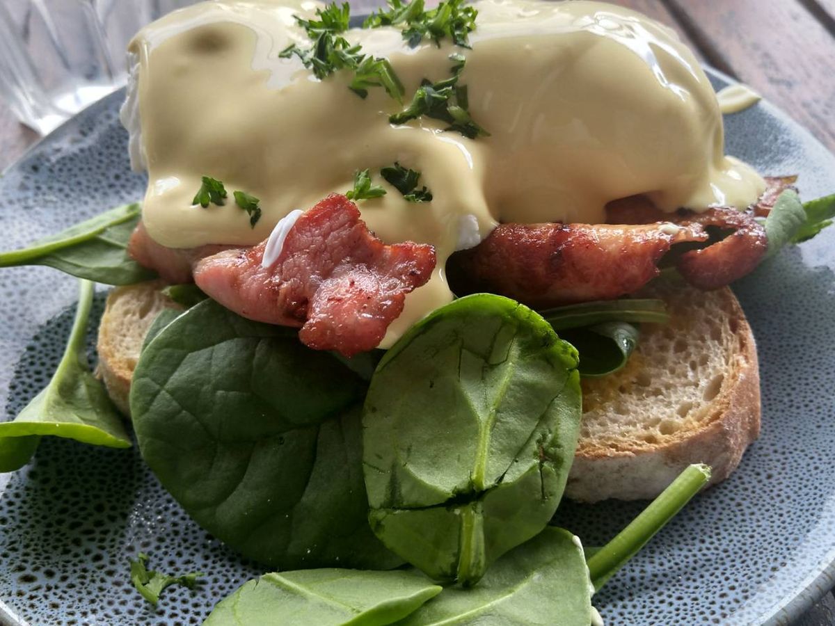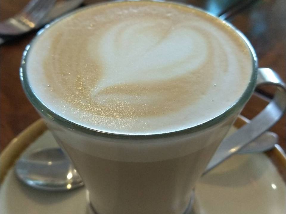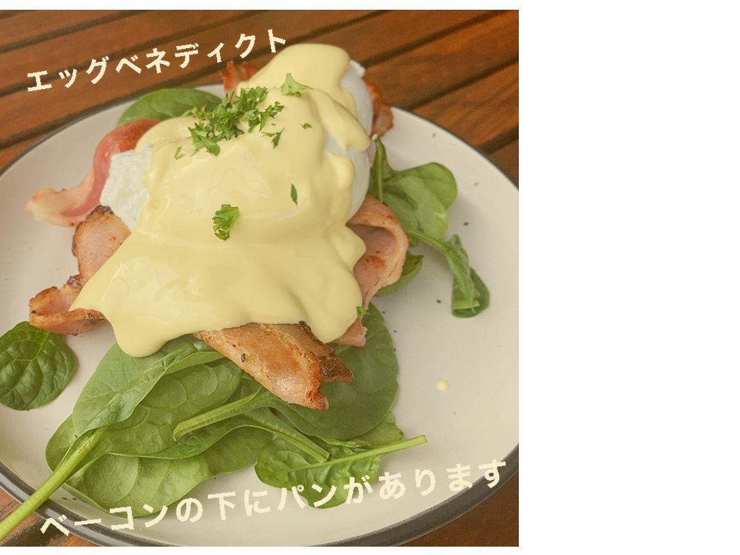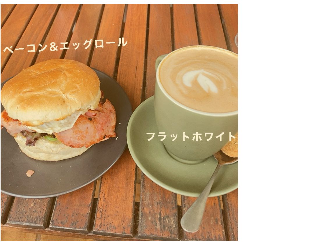 ストップ1、エッグベネディクトとホワイトフラット(カフェラテ)をいただく。とても美味しい!予めメニューがメールで来ていて注文しておきました。