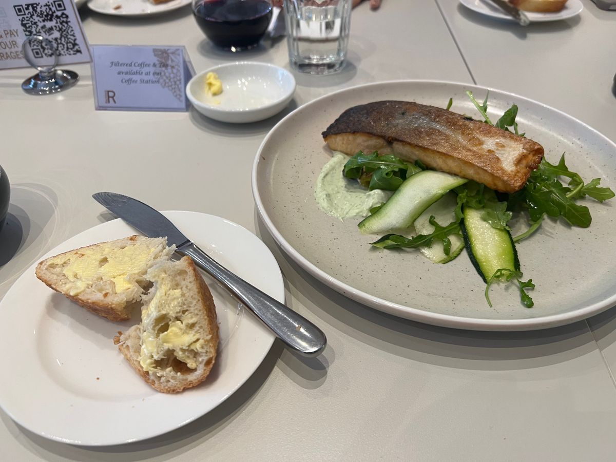 十分な量のサーモンとたっぷりのとても美味しいクリームチーズ。パンは、トーストされているので切りにくいです。おしぼりは貰えないようで、ナイフとフォークを包んでいたナフキンを皆使っていますが、ウエットティッシュは持参した方が良いと思います。