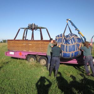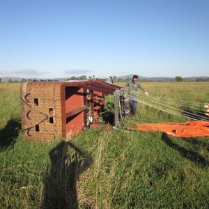 着地地点近くになると いざ着陸のスタンバイ。 ビデオガイドの通り しっかりつかまり、着地。 ん? これは 着陸成功なの?(笑)と 「クスクス」笑い声と共に皆の乗った籠が横たわった状態で着陸。一人一人引き出されたあと皆で気球を畳みました。 思ったより重労働で へとへとになりました。 その後 気球の乗せた車の荷台の横につかまって 朝食場に移動。 日本では ありえない光景で 楽しかったです。