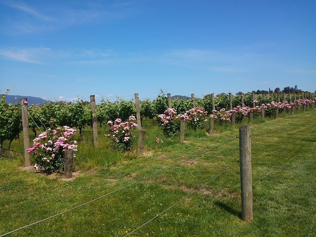 4軒目はスパークリングのドメーヌ・シャンドン。とても立派で大きなワイナリー。施設内をけんがくしたあとは好きなスパークリングを1杯もらって大きなレストランの外のバルコニーでブドウ畑を眺めながら乾杯。フドウの樹の横にはバラガ植栽されていて、赤はピノ、ロゼはムニエ、白はシャルドネと品種が分かるようになっています。小さい子供達がブドウ畑に向かって走り回っている。とても幸せな風景でした。