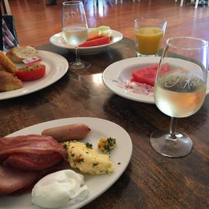 着陸はバウンドする事なく、最後まで安全な旅でした。みんなで、片付けをしてバスに戻り、朝食を食べにワイナリーに移動します。ウェルカムワインとバイキング形式の朝食を召し上がりました。
