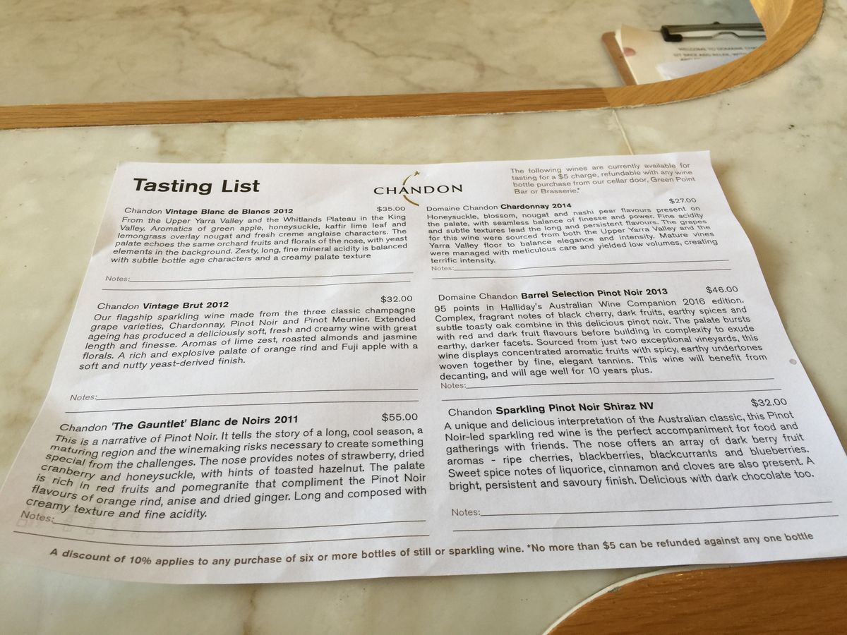 ドメイン・シャンドンではグラス1杯の試飲と軽食でしたが、少し時間に余裕があったので、+5ドルで6種類の試飲ができました。(この5ドルはワインを購入すれば購入代金として戻ってきます)