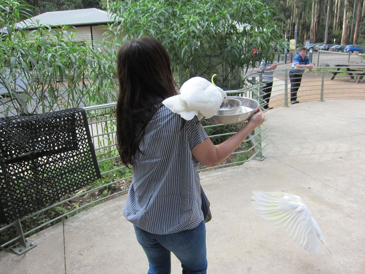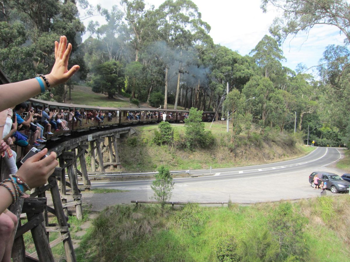 土曜日のツアーだったので,市外に向かう一般道,高速道ともに混雑はなく,野鳥の森で野鳥の餌付けを観察(半袖だと腕にとまった鳥のつめでけがをすることもあるといわれ餌付けは自主的に遠慮)したのち,10時半出発のパッフィングビリー蒸気機関車に乗車体験しました。都会育ちの妻は蒸気機関車に乗ることが初めてで大興奮してました。約20分の乗車体験でしたが,窓枠につかまりつつ足を外に出して乗車するスタイル(ガイドさん曰く「正式な乗車スタイル」)でとても楽しい蒸気機関車体験が出来ました。
