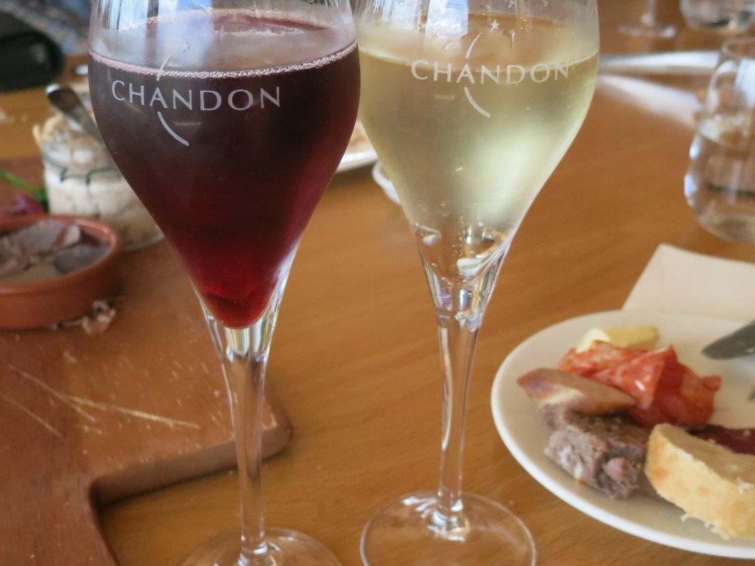 私たちは、どちらかというとアルコールには弱い方ですが、それでも十分に楽しいツアーでした。ワイン通ではないので、ワインそのものの善し悪しや飲み比べのコメントはできませんが、各ワイナリーが客を受け容れるべく手入れしている庭を見たり、ワイン畑を遠望したり、各ワイナリーのイチオシの試飲も楽しめました。ドンペリで有名なシャンドンのワイナリーも訪問コースに含まれていて、良い思い出になりました。写真はシャンドンのワイナリーと、そこでのスパークリングワインつきの軽食です。