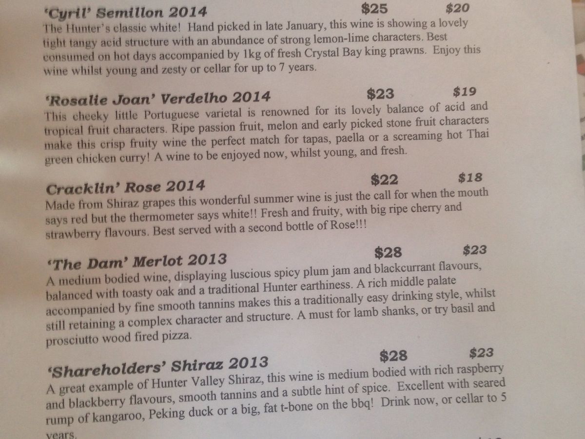 ハンターバレー自体がとても風光明媚なところで、ブドウ畑、湖、牧場などが広がるのどかなところです。ハンターバレー自体が観光地のようで、ワイナリーのほかに、かわいいお土産屋さんのあるパークにも立ち寄ってくれました。さすがにワイン、ビールを飲む人はいませんでしたが、日差しの強い暑めな一日だったので、アイスやチョコを口直しにたしなむ人が多かったです。。