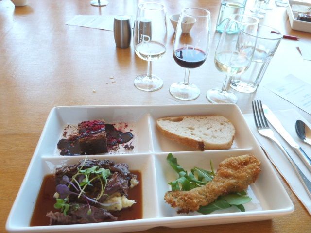メニューは前菜がパンとスープ、三種のハムから選べ、メインは赤ワイン、白ワイン、ビールから選べました。飲み物に合わせて食事も違いました。それぞれ3杯ずつドリンクがついています。ちなみに私は白ワインを選びましたがとてもおいしくいただくことができました。