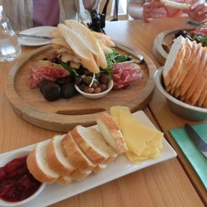テーブルには、いっしょにつまめるように、クラッカー、チーズ(カマンベール風、青かび、スモーク、他)、乾燥アンズ、イチゴ、ジャムが山盛り。楽しいし美味しい!