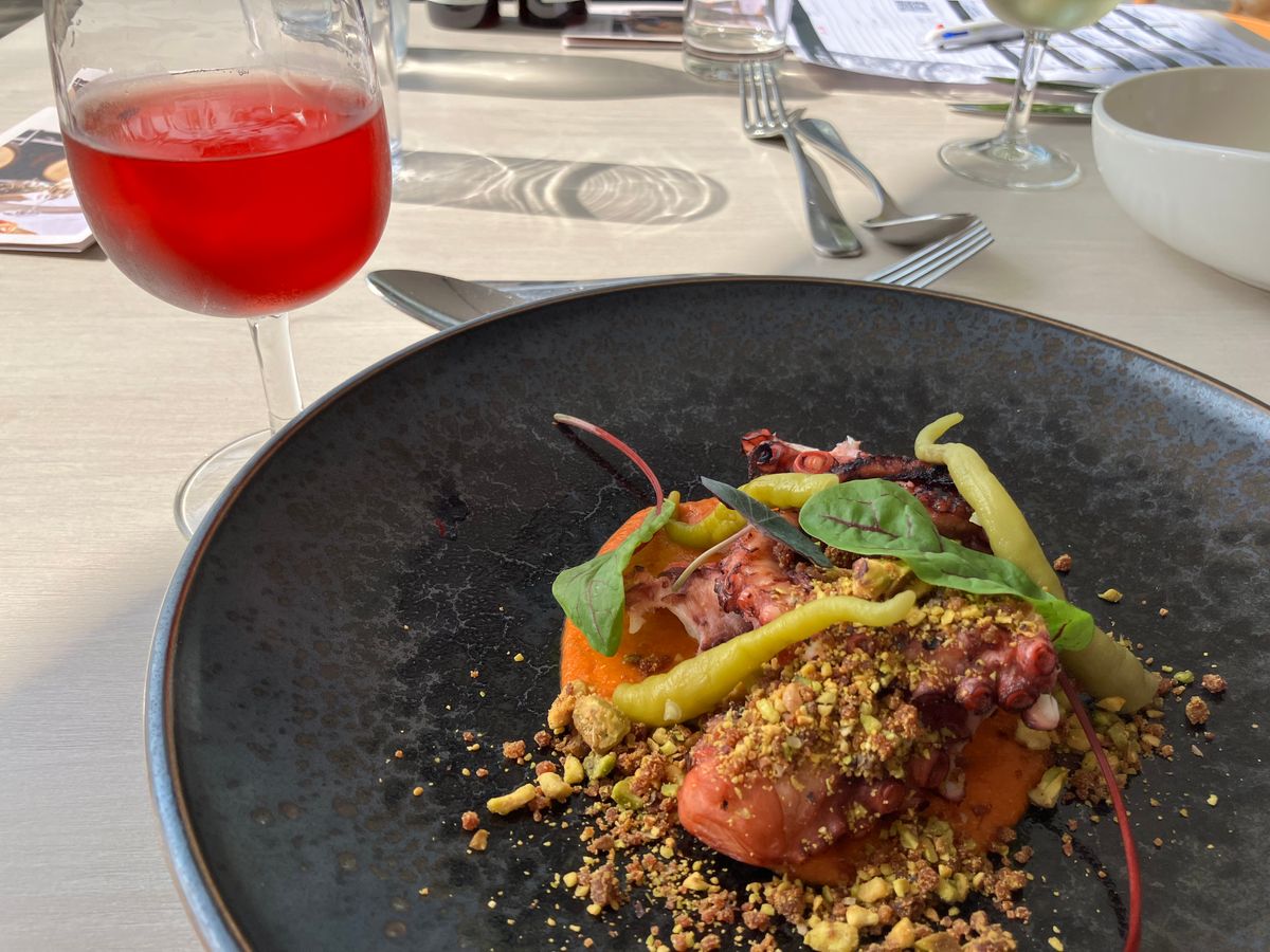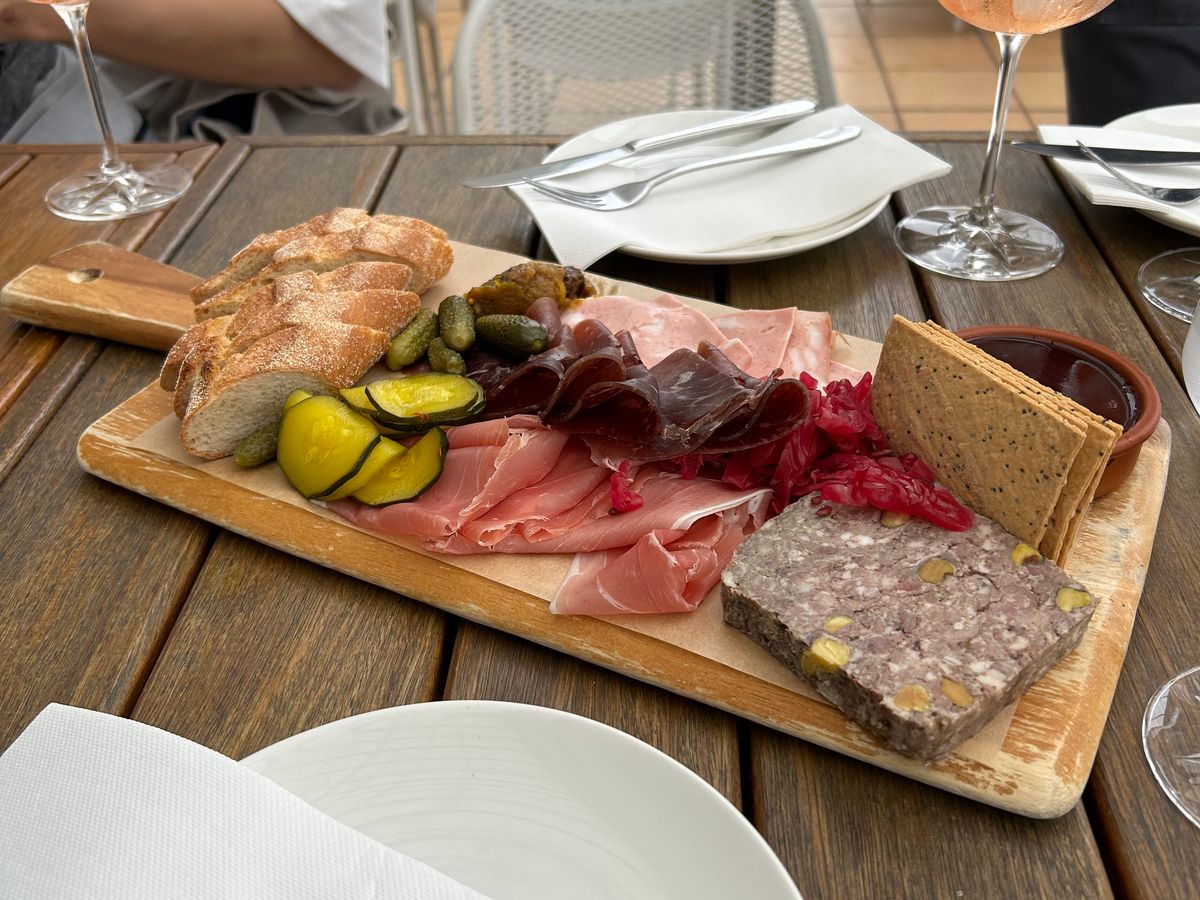 葡萄畑を眺めながらのランチは心地よく、生ハムやサーモン、パテ、テリーヌ、海老のグリル、ピクルス等々どれもワインと合う美味しい食事でした。