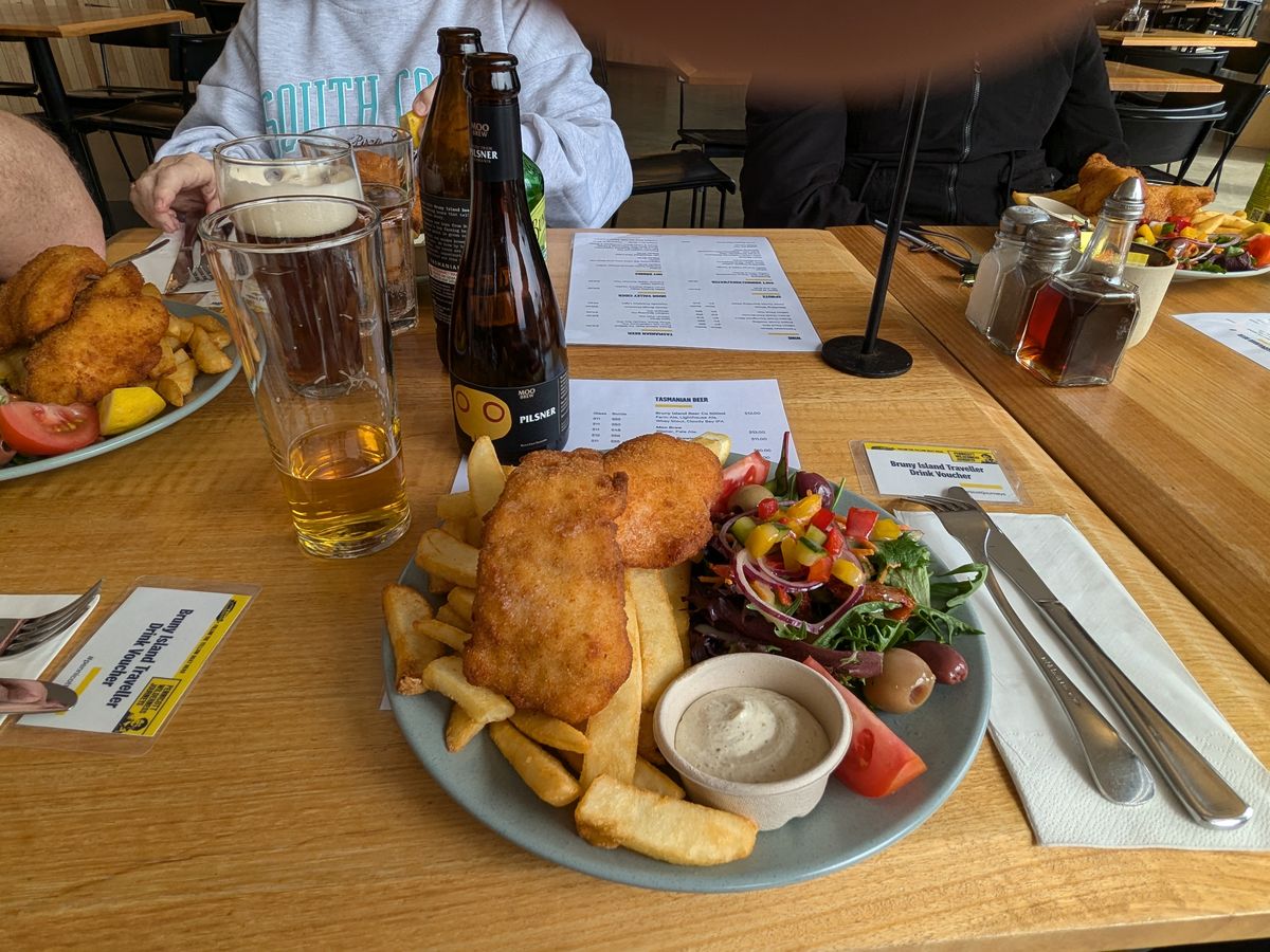 ランチはホバート名物と言うFish&Chipsですが要は魚フライとフレンチポテトでグルメと呼べるか怪しいレベルです。市内の港周辺にも沢山のレストランがありますが、一度食べるならこのツアーで良かったです。生牡蠣は少しスリルとあって美味しかったです。