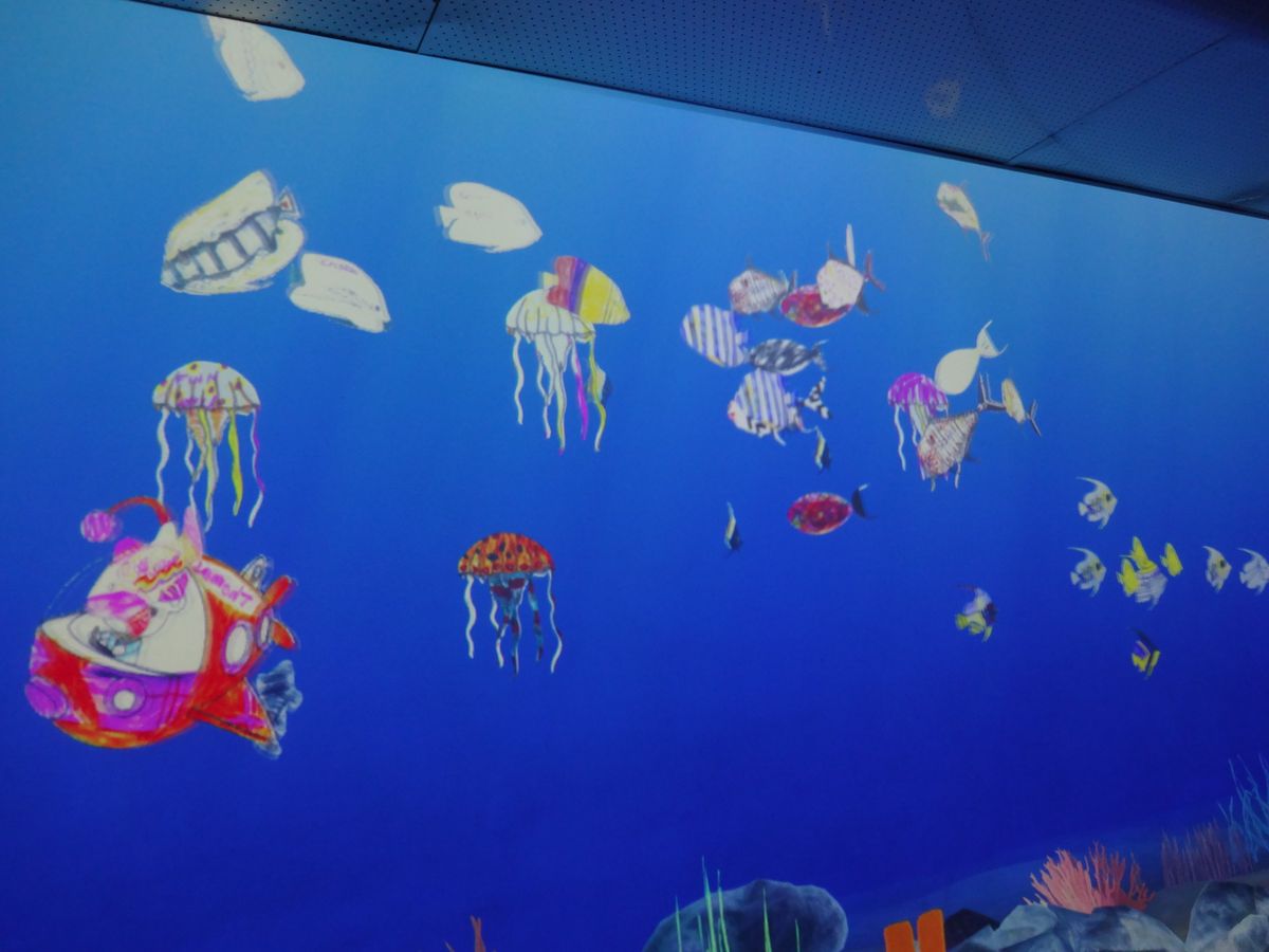 7歳の娘は、自分で色を付けた魚やクラゲの絵をスクリーンの海に泳がせることができる遊びが気に入ったようです。