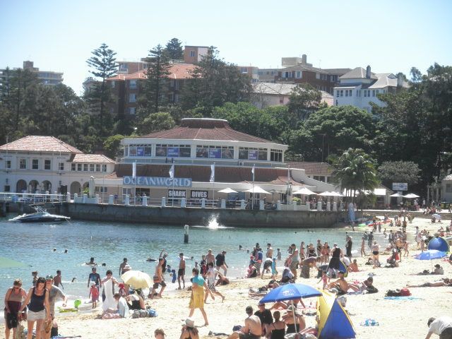 サーキュラーキーまでスカイレールで行き、サーキュラーからダーリングハーバーをフェリーで行って、水族館とワイルドライフを見学した後、ダーリングハーバーからサーキュラーキー、サーキュラーキーからマンリー島へフェリーで行きました。マンリー島はバカンス地で、海水浴をしている人がたくさんいました。オーシャンワールドマンリーは海水浴場のすぐ隣にあり、水族館の小さな感じでした。