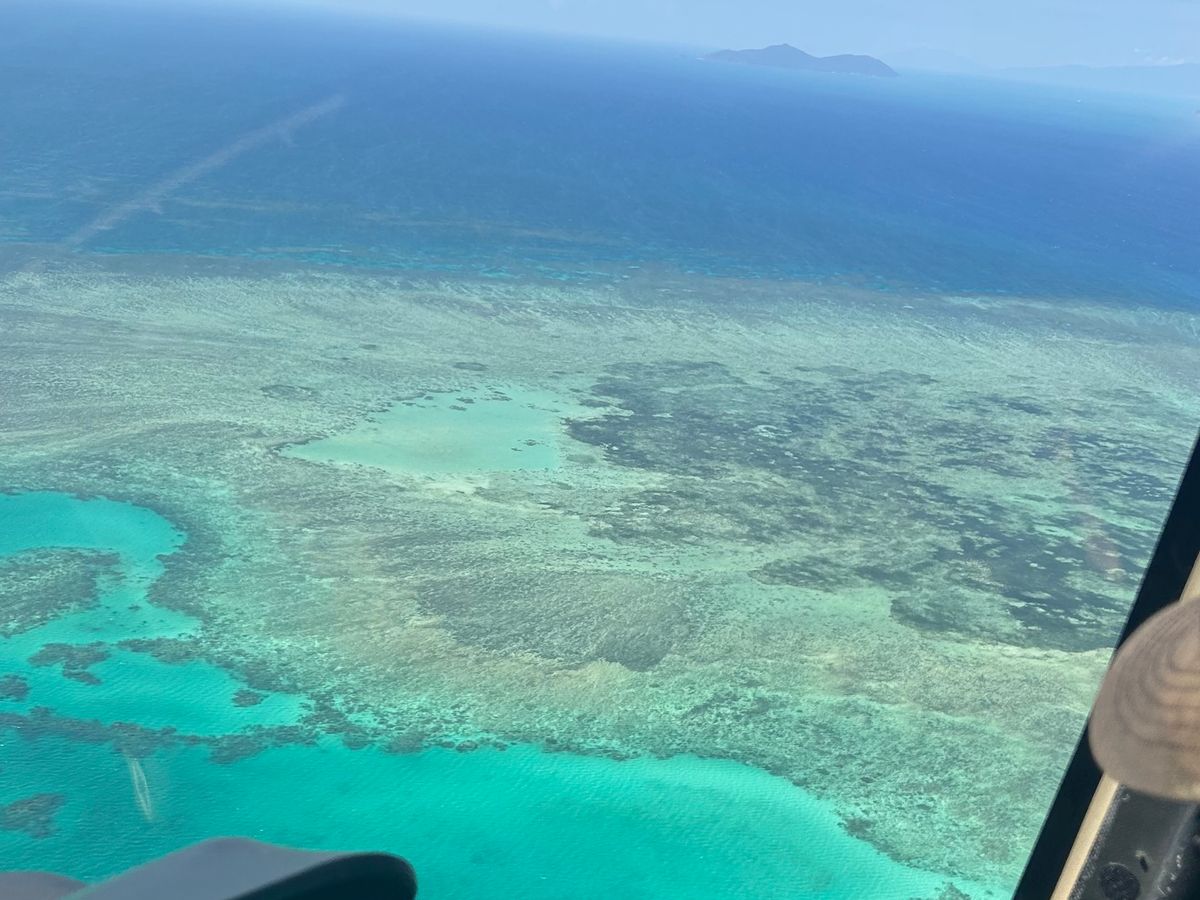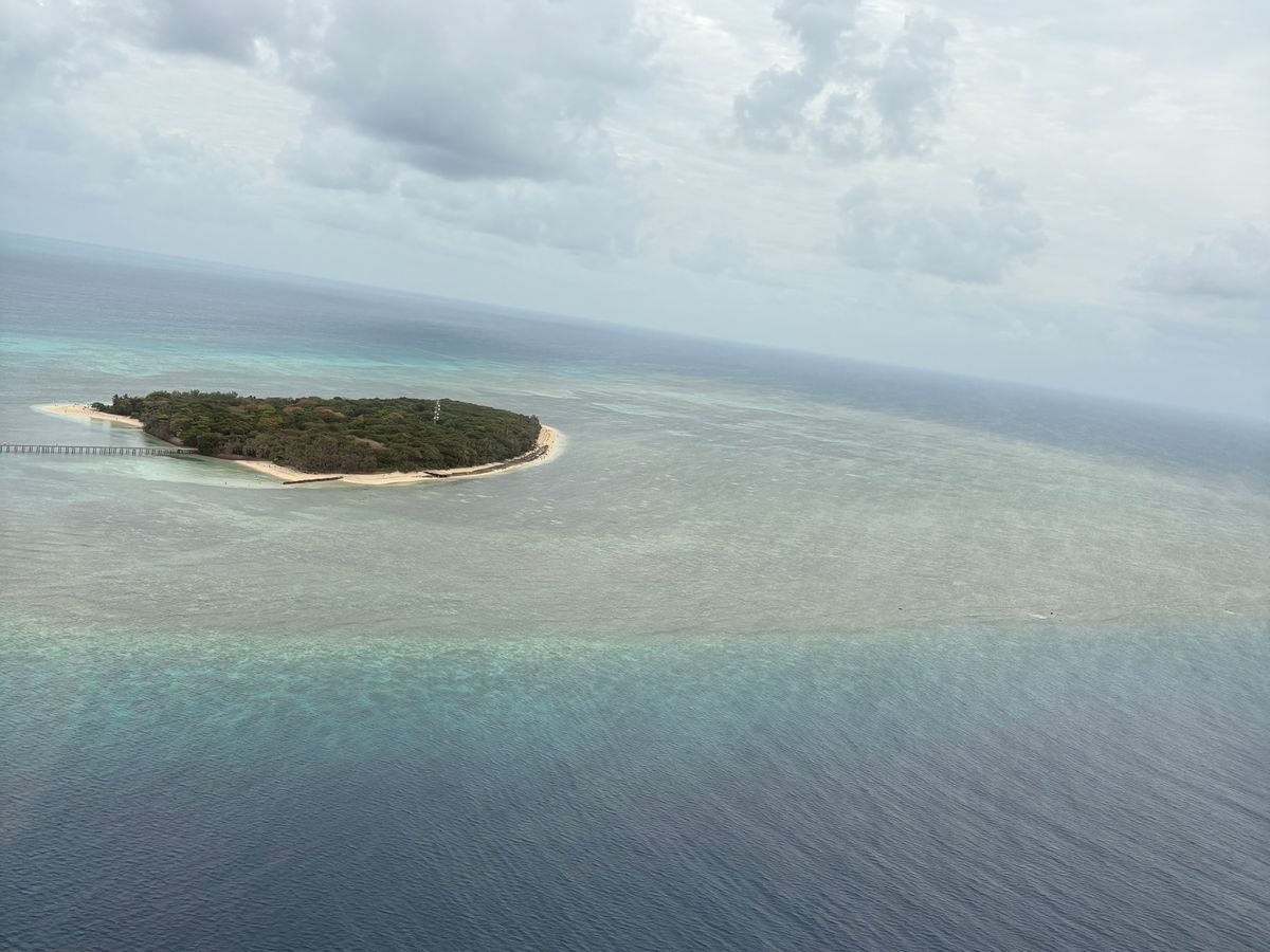 当日は曇っていて、船に乗っている間には雨が降っていたので、ヘリが飛ぶのか心配でしたが、なんとかヘリコプターに乗ることが出来ました。空が灰色だったので他の方の写真のようなきれいな景色ではありませんでしたが、広大なサンゴ礁を空から見ることができる貴重な体験だったと感じています。
