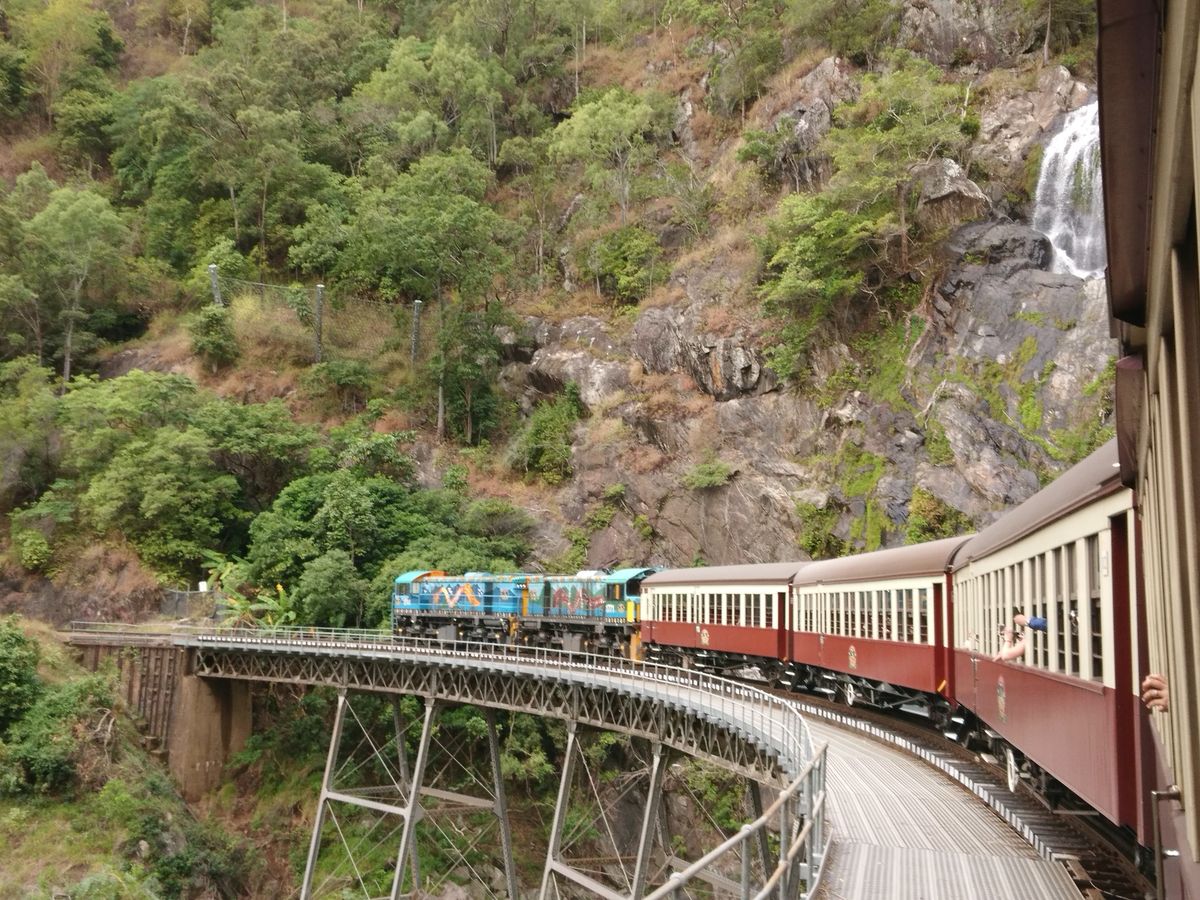キュランダ高原鉄道。最終便15:30発です。2時間と長い電車移動ですが、見所たくさん。写真や動画撮っていたら、あっという間に下界に降りてきます。最初は一車両にぎっしり席を詰められますが、後で、移動可能です。ニコニコした添乗員さんが面倒見てくれます。