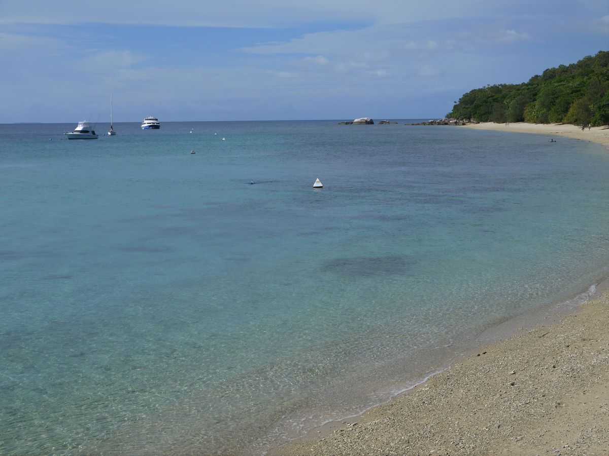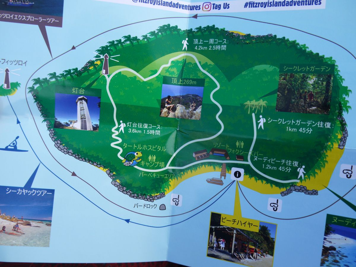初めて尽くしで私は全てが必死でした。リトルフィッツロイ島までのシーカヤックは予想以上に距離があり、体力が要りました。戻れないかもしれないと、途中不安になったぐらいです。でもなんとか、日頃のジム通いの筋トレが役に立ち、体力はもちました。リトルフィッツロイ島到着後、またまた初めてのシューノーケル。でも、ライフジャケットをつけたままだったので、これもまた必死でしたが楽しめました。空は曇っていても、魚たちが良く見え、小さなシャーク、ニモ、縞々の色鮮やかな魚が間近で見れ、数秒ですが一緒に泳ぎました。カヤックを漕いでいると、ウミガメが顔を出してくれました。ビーチハイヤーへ帰り、ランチをして、その近くでシュノーケルを楽しみました。ここでも魚の小さな群れを見ることができました。朝リーフターミナル出発時は、雲が漂い雨も降ってましたが、昼過ぎからは晴れ間が出てきて、景色がどんどん奇麗になってきました。リラックスし、のんびりと島の雰囲気を満喫しすぎてしまったので、島の散策を忘れてしまいました。それがだけが後悔です。まだまだやり残したことがあるので、また行きたいです。