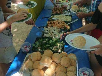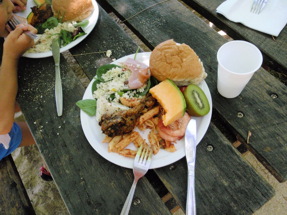 お昼もこのフランクランドは他の島ツアーで見るランチより豪華だなと感じました。チキンやポテトサラダ、お肉の種類も幾つかあり、バンズに挟んでバーガーとして食べらるおかずになっていました。ビュッフェも盛り沢山もれたし、お腹パンパンになるくらいでした。