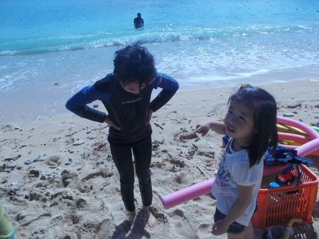 5歳の娘は自分では泳ごうとしないので、凍えて15分らいで断念してしまいました。(その後浜辺で機嫌良く遊んだモヨウ)。