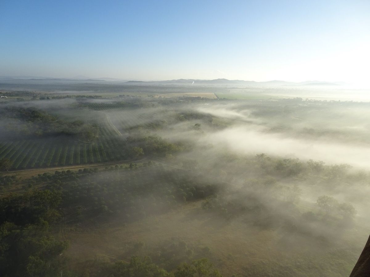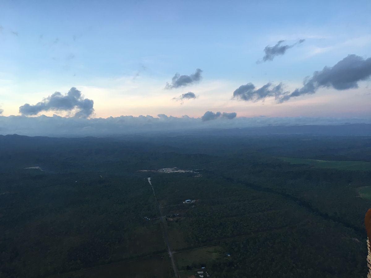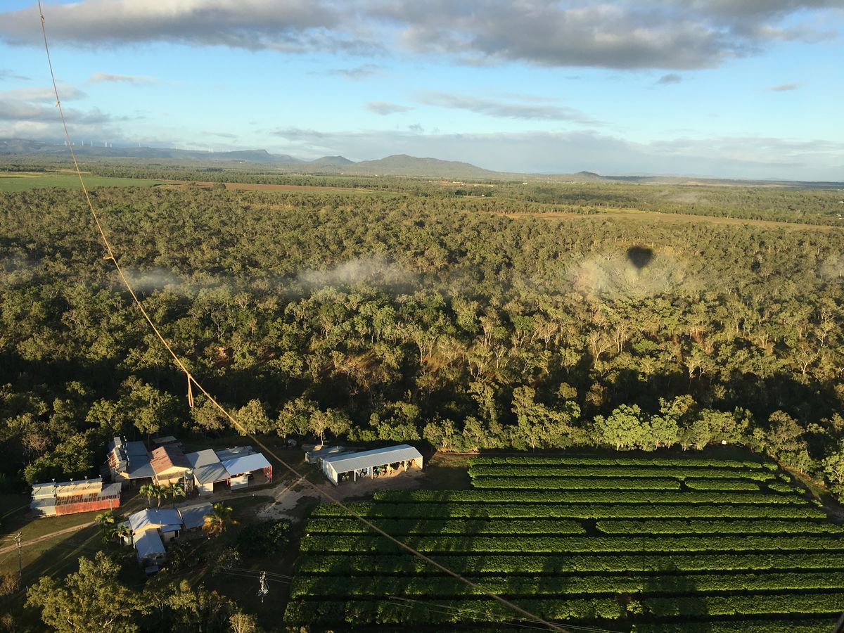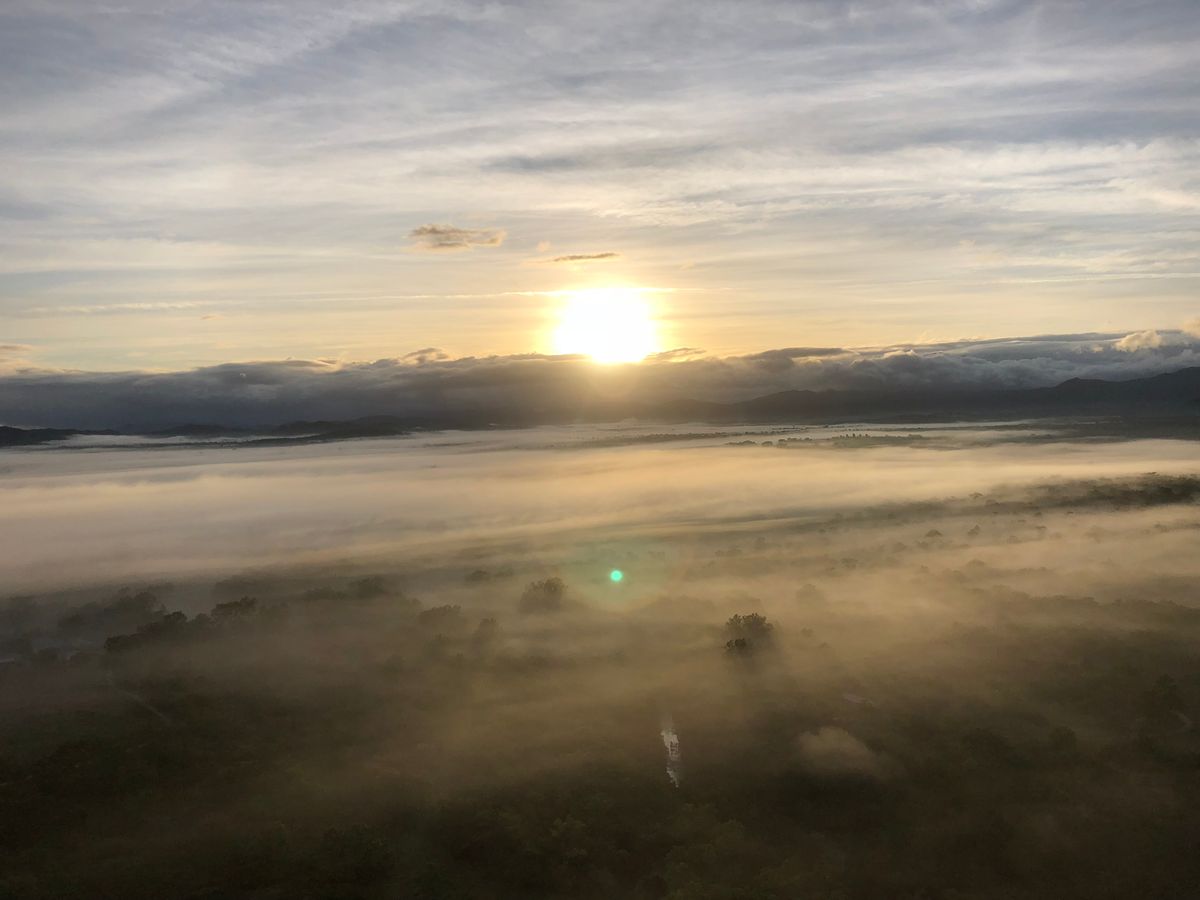 当日早朝、笑顔が素敵で参加者への気遣いが素晴らしいトニーさんのドライブで離陸地点のマリーバへ。周囲が薄暗い朝霧の中、気球が膨らんでいく光景と時々聞こえるバーナーの音がすでに幻想的。乗り込んだバスケットがふわっと浮き上がる瞬間の感動!その後の絶景は、もう言葉になりません。飛行機と異なり、上空の風を感じながらの空中飛行でケアンズの美しい景色を上空から優雅に鑑賞し、癒されました。