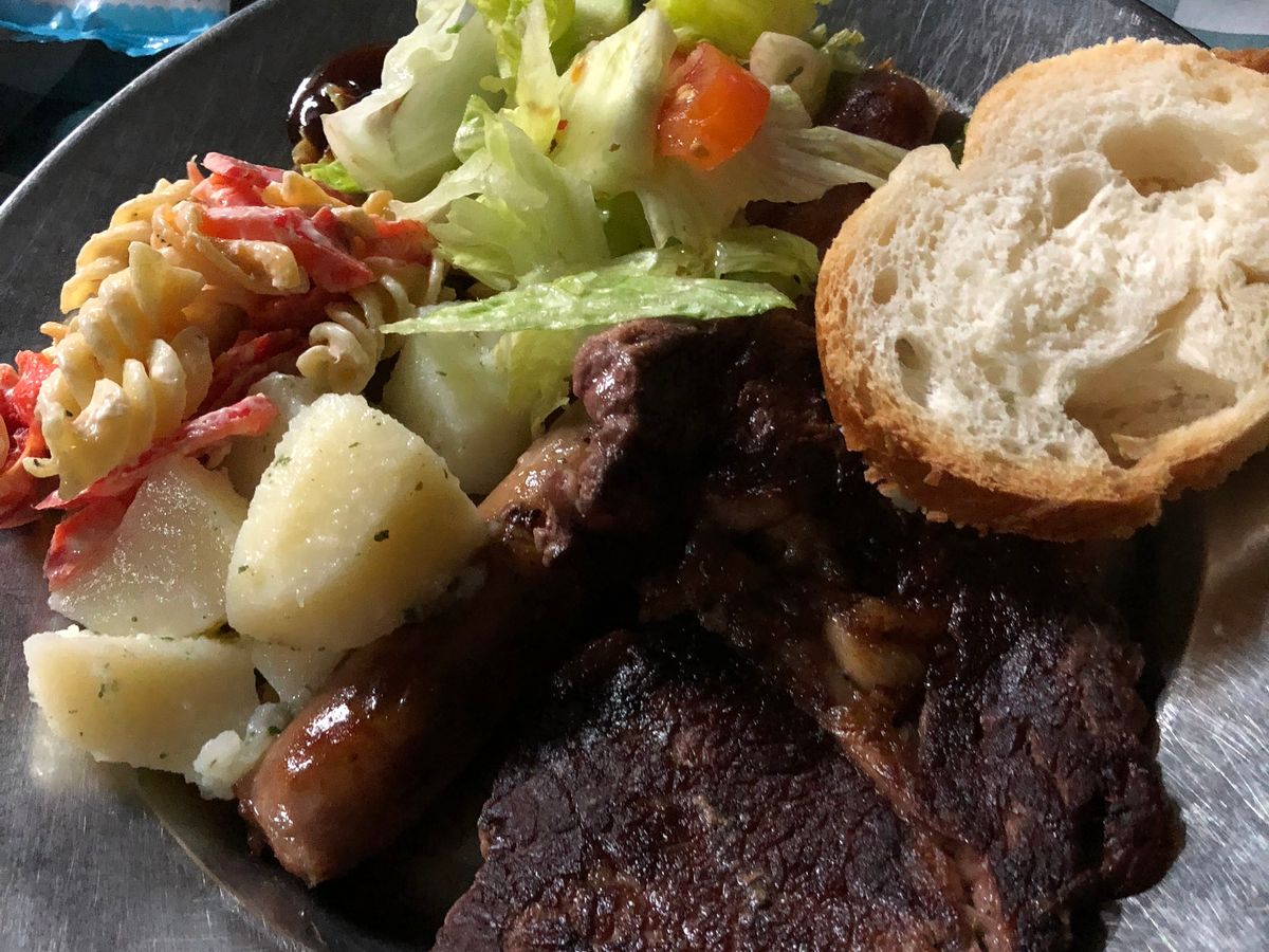 カンガルーの尻尾、ワニのお肉にビーフステーキ、サラダ2種にパン、パンプキンスープが夜ご飯です。