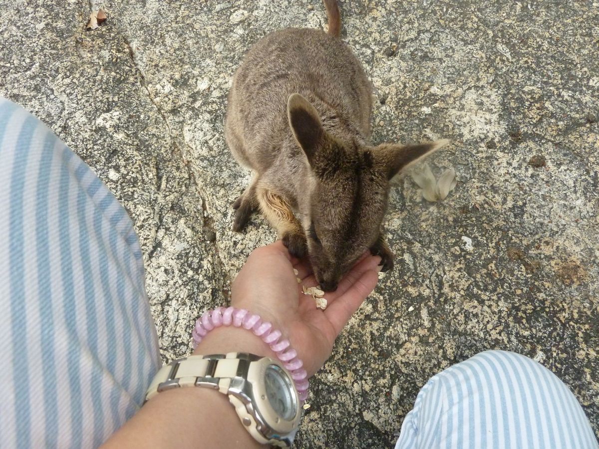 (本人は、枝になっているつもり!!) 次に、ロックワラビーがいる場所へ。私たちが、行くや否やロックワラビーが沢山集まってきました。餌をスタッフから頂けて、ロックワラビーが手から食べてくれました。とってもかわいいー!赤ちゃんが袋から顔をだしていた子も。最高!