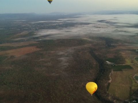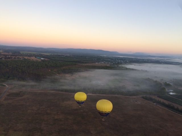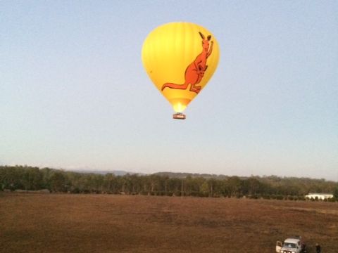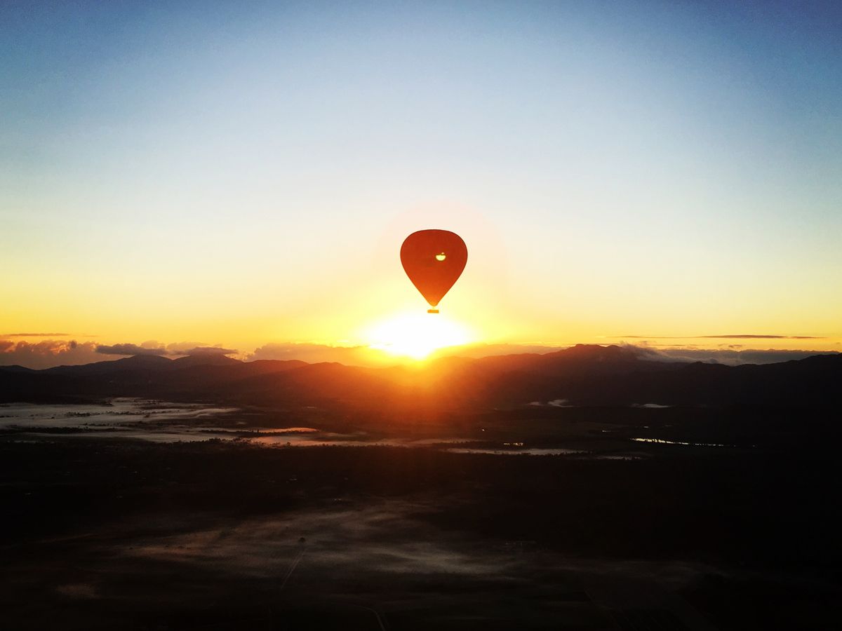 朝4:10にピックアップ。20人ほどいました。1時間の道中白人ドライバーの方が頻繁に無線でやりとり(英語)をしていたので気になっていました。着く直前トイレ休憩の際に、今日は風が強いので飛ぶかわからないと言われました。到着すると、4つの気球の準備がされていましたが膨らんでおらず、30分ほど待たされた上、操縦士の方から中止と言われました。残念でしたが、無理に飛ばして事故にあうより良かったと思います。寒くて空が澄んでいたのか星がとてもきれいで驚きました。振替るか返金か聞かれ、私たちだけが帰国日に振り替えることができました。ホテルに帰ると寝不足で辛かったので、午後からのツアーまで昼寝をしました。帰国日再チャレンジ。スーツケースを梱包しすぐチェックアウトできるようにしてから出発しました。今度は日本人ドライバーの方で、バスも日本人の方だけで満席でした。着くとすでに4つの気球が膨らんでいました。全員乗り込むとぎゅうぎゅうでした。時々バーナーから火が出てすごい音に驚きました。ふわっと浮き上がりどこからか飛んできている他の気球も見えて子供たちも興奮していました。そのうち日の出が見えてきて感動的でした。高度を上げたり下げたりしてくれて、下がった時にカンガルーが跳ねているのが見えました。気球に取り付けられているカメラで飛んでる最中に集合写真をとりました。飛ぶ前を降りた後にも撮ってもらいましたが、その写真は帰国後にネットより注文できるので、写真代を持っていく必要はありません。保険代だけで大丈夫です。牧場に着陸したので馬糞だらけでした。そこでみんなで気球をたたむ作業をしましたが、エクスプレスプランだったのと、私たちを含めて帰国日の方が何組かいたので、ドライバーの方が途中で切り上げてくれ、追いかけてきていたトレーラーの荷台に乗せられバスまで移動しました。ケアンズに向かうバスの中から青空に飛んでいる気球が見えて、子供が「絵葉書みたい」と喜んでいました。帰国日に参加するのはきついと思いましたが、最後の思い出になりかえって良かったと思いました。すべてが初めての事でとても良い経験になりました。とてもおすすめです。