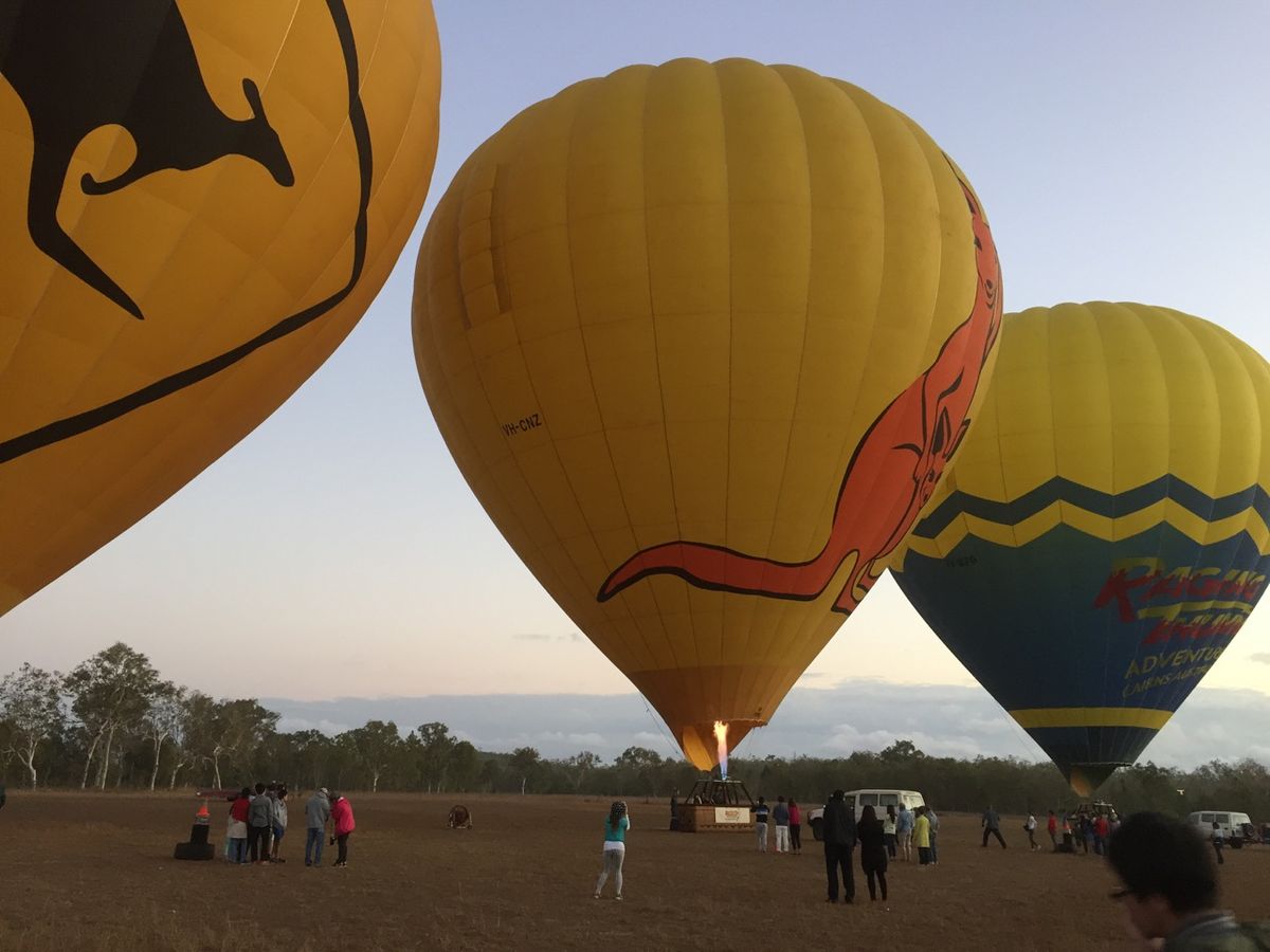 私たちは2015/11/22に夫婦二人でこのホットエアーバルーンのツアーに参加させて頂きました。オーストラリアのケアンズへのハネムーン旅行が決定した当初は、オーストラリアで熱気球。というイメージが正直あまりありませんでしたが、実際に参加してみたところ夫婦共々、このツアーは絶対に外せないと感じました。私たちは、二人とも片言の英語しか話せず、現地ツアーへの参加は正直不安が多かったですが、このホットエアーバルーンのツアーは現地日本人スタッフもおり、送迎から熱気球への乗り方等、丁寧に対応して頂けました。移動中の車内での、熱気球の乗り方も含めたツアーの概要を説明するムービーも日本語対応していました。ただ、送迎バスのドライバー、熱気球のパイロットは現地オーストラリア人だったため、話している内容が理解できないことは多々ありましたが、理解できないことで支障は特になく、周りの参加者の動きに合わせていれば問題ないような感じでした。ツアー実施日当日は早朝から雨が降っており、実施が危ぶまれましたが、離陸地点到着時には雨も止み、無事に飛行できました。運良く虹も見ることができ感動しました。気球からの景色は息をのむほど素晴らしいもので、オーストラリアの広大な大地が圧巻でした。また飛行時には英語ではありましたが、パイロットからの気球についての説明や見える景色の説明などがあり、興味深いものでした。