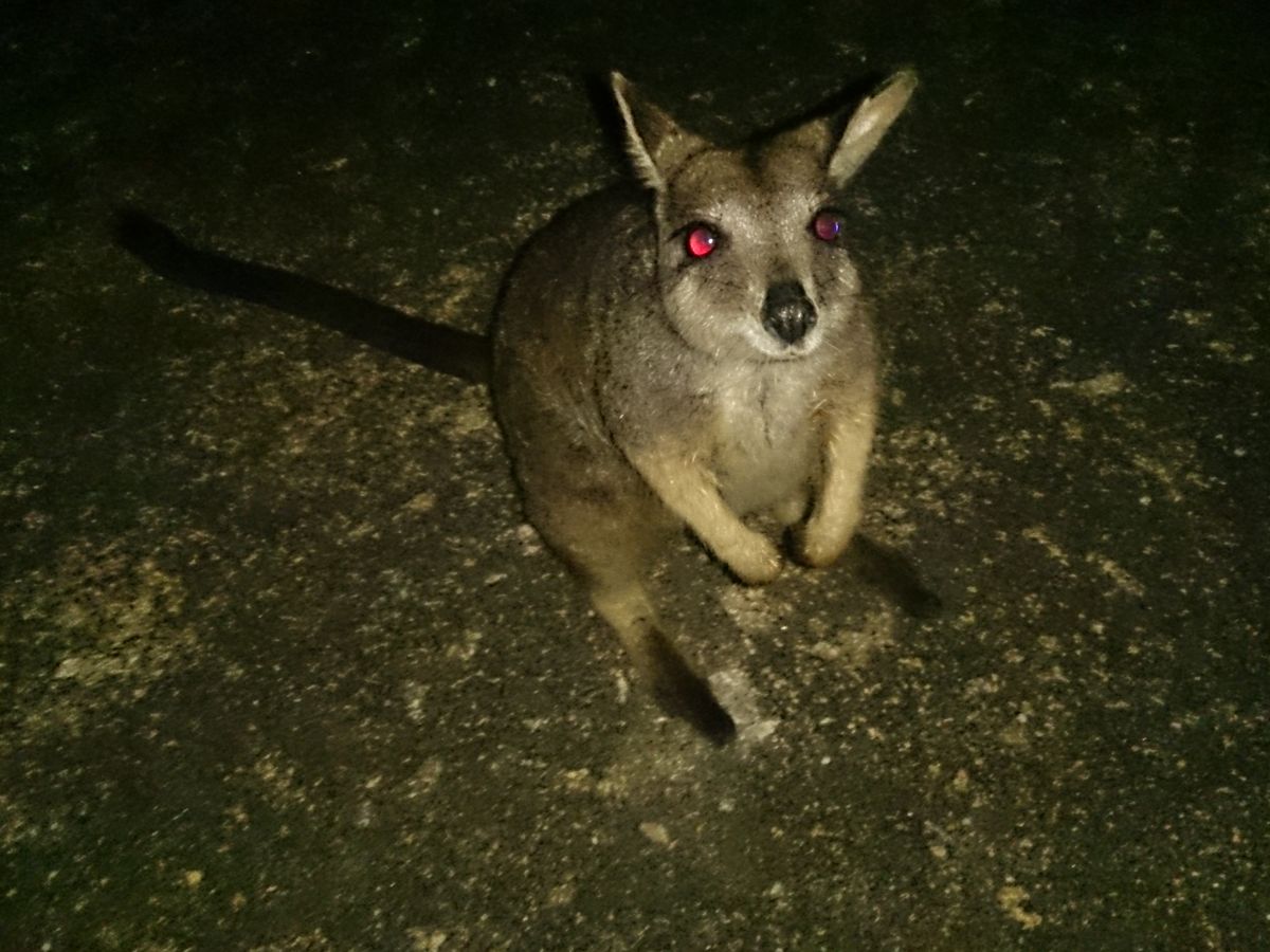 途中大きなアリ塚を見たり、たまに車窓から動物がちらっと見えたりしながらバスはひた走ります。目的地につくと、ロックワラビーとご対面。ちょうどその時、一瞬ですが雲が晴れて見事な星座が見れました。
