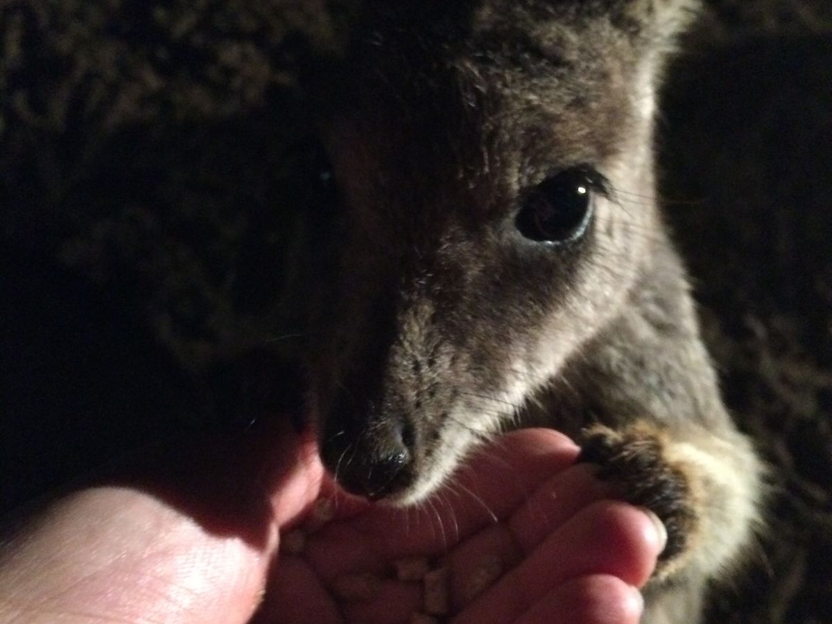 その日は雲が多くガイドのヨッシーさんの努力をもってしても星空は見られませんでしたが、片道1時間以上の道のりを軽快なトークで彼は盛り上げてくれました。山道がハイウエイになっており80km/h程で灯りのないところを走るのでレンタカーではやはり無理だと思います。途中から木の丈が短くなったところで蟻塚がたくさん見え始め高さ2m程のものを見学しました。どんなに大きい蟻がいるのかと思いきや日本にもいる普通の大きさの蟻で逆に驚きました。いよいよマリーバに入ってきたなと思うところで30センチ位のワラビーが車道際に見え期待度アップ。キャンプ場に着くと車の気配でロックワラビーがお客の数だけ6匹程寄ってきました。中には赤ちゃんがポケットからのぞいているワラビーもいて、凄く可愛かったです。餌やりをしていると「ワタシも~」と服に前足を掛けておねだりする子もいて本当に家で飼いたいぐらいでした。ここでしか見られない個体数の少ないワラビーだそうで観に行く価値はありますよ!