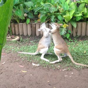 道中では野生のワラビー、野ウサギ、ワライカワセミ、フルーツバット、コクチョウなどたくさんの動物に遭遇!