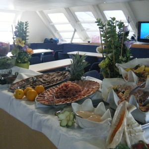 ただ、何人かの方が書いている通り、現地の時間がせわしいです。10時半過ぎに到着して島行きのボートに乗って島に到着が11時前。ちょっとシュノーケリング(これは最高の経験!!)して12時過ぎに船に戻ると昼食は長蛇の列。キョンキョンが「いくらでもおかわりしてね」といっていたお勧めの魚フライが1人1個の制限付き・・・。