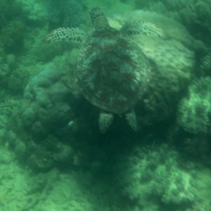 私は昼食後に持参したるるぶを見返しているとライフガードのいない方のビーチ(船着場から見える方)の桟橋のあたりでウミガメが観れるとの情報が書いてあったので1人で行ってみたところまさに情報通りで岸から100mも泳いでいない浅瀬だったと思いますがバッチリウミガメを見る事ができ3分くらい一緒に泳げて大満足でした!!大興奮で家族の元に戻り、今度は夫と7歳の長女で泳ぎに行ったところ彼らもウミガメを見れたそうです。私だけみられなかったと残念がっていた次女も帰りの船に乗る際に桟橋のところでウミガメを見れたのでよかったです。