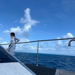 ミコマスケイの海の青さを表現するなら、まさに「エメラルドブルー」と「ターコイズブルー」の融合。太陽の光が反射して、透き通るような輝きと深い青のグラデーションが広がり、まるで宝石のような美しさ。静かに揺れる波間には透明感があり、その下に広がるサンゴ礁や海中の生き物たちが、青さにさらに命を吹き込んでいるかのようでした。ほんと言葉では完全に表現しきれない、自然が作り出す壮大なアート。私自身どのクルーズにしようかと迷いましたがほんとにこのツアーに参加して良かったです。島には一隻のみ100名程度ですし、日本人の参加者が少なめなのも良かった点です。