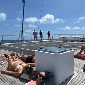 船上では、写真のように前方デッキで横になって陽を浴びる事が出来ます。なかなか体験出来ないと思うので是非お試し下さい。船酔いが心配な方は、船内よりこちらの方が爽やかな風と陽を浴びれて良いと思います。