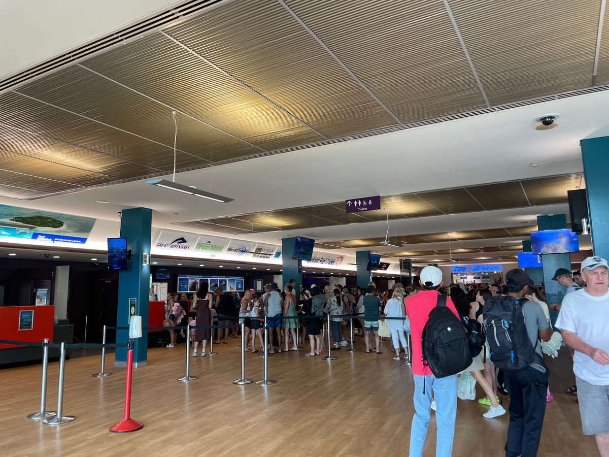 バウチャーは画面提示で大丈夫なようでしたが、念のため日本で印刷したものを持参しました。8:00~チェックイン開始で7:45ぐらいにターミナルに到着しましたが、受付してくれました。日本語を話すスタッフさんが何人かいるみたいでした。印刷したバウチャーを見せるとその場で回収されて、乗り場の説明後搭乗チケットを渡してくれました。アウターリーフに行くツアー参加者を見分ける為なのか、緑色のシールを服に貼って下さいと言われました。