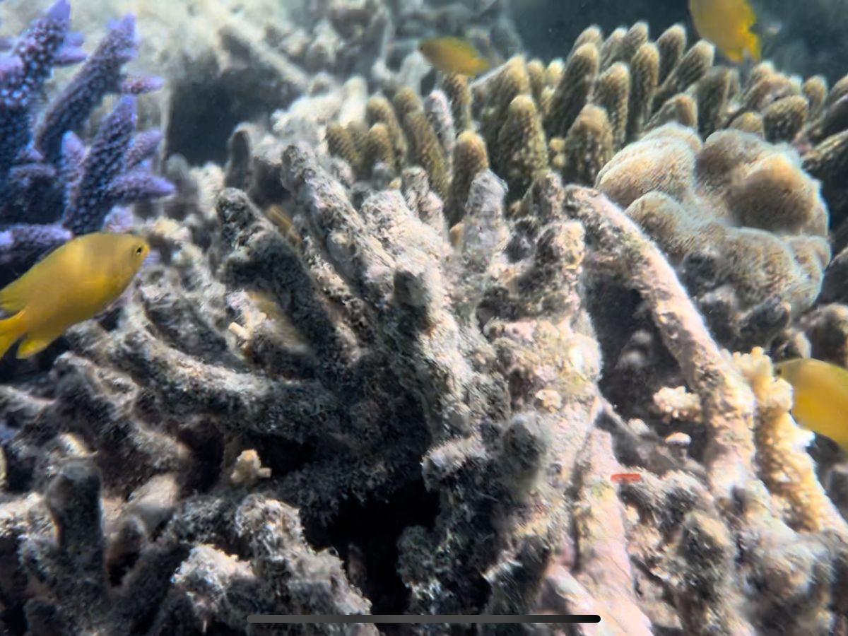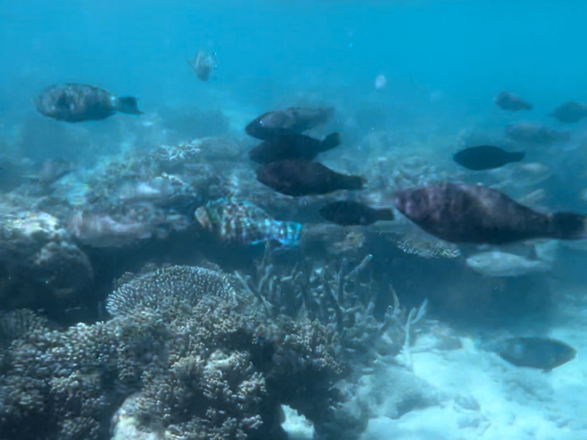 天気が悪いのが原因かもしれませんが、魚が見れるところは、グラスボトムボートが行くような少し沖合まで行かないとみれないようでした。ちょっと勇気がいります。ほぼ誰もシュノーケリングでは行ってない感じでした。