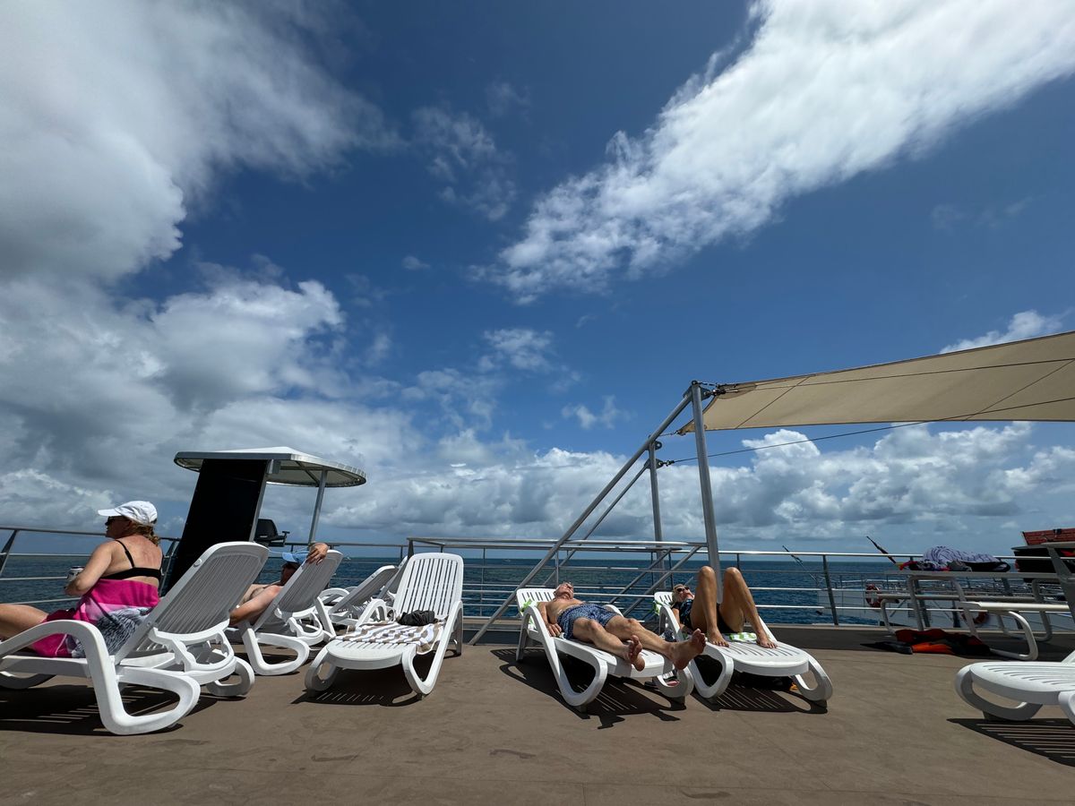 ポンツーンでは好きなタイミングで自由にシュノーケリングができるので、船内でごはんを食べてゆっくりするもよし、シュノーケリングするもよし、屋上で寝そべるもよし、半潜水艦やグラスボートにのるもよしで、各々が自由気ままに過ごせます。